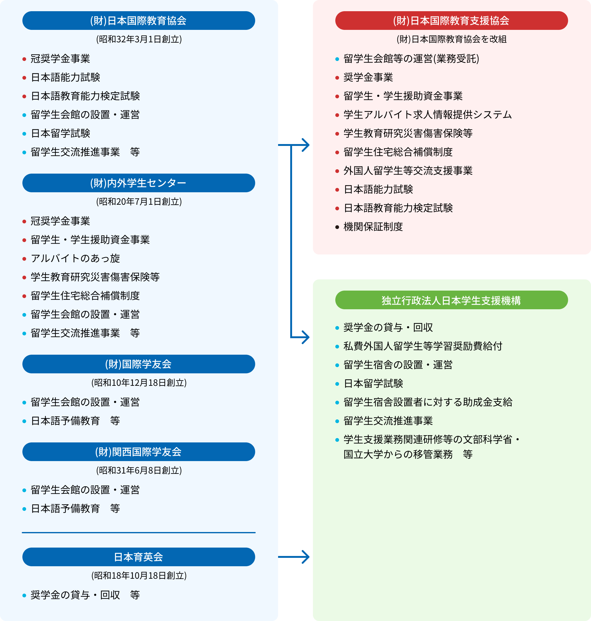 2004(平成16)年4月1日、特殊法人日本育英会・財団法人内外学生センター・財団法人国際学友会・財団法人関西国際学友会と業務を整理統合し、