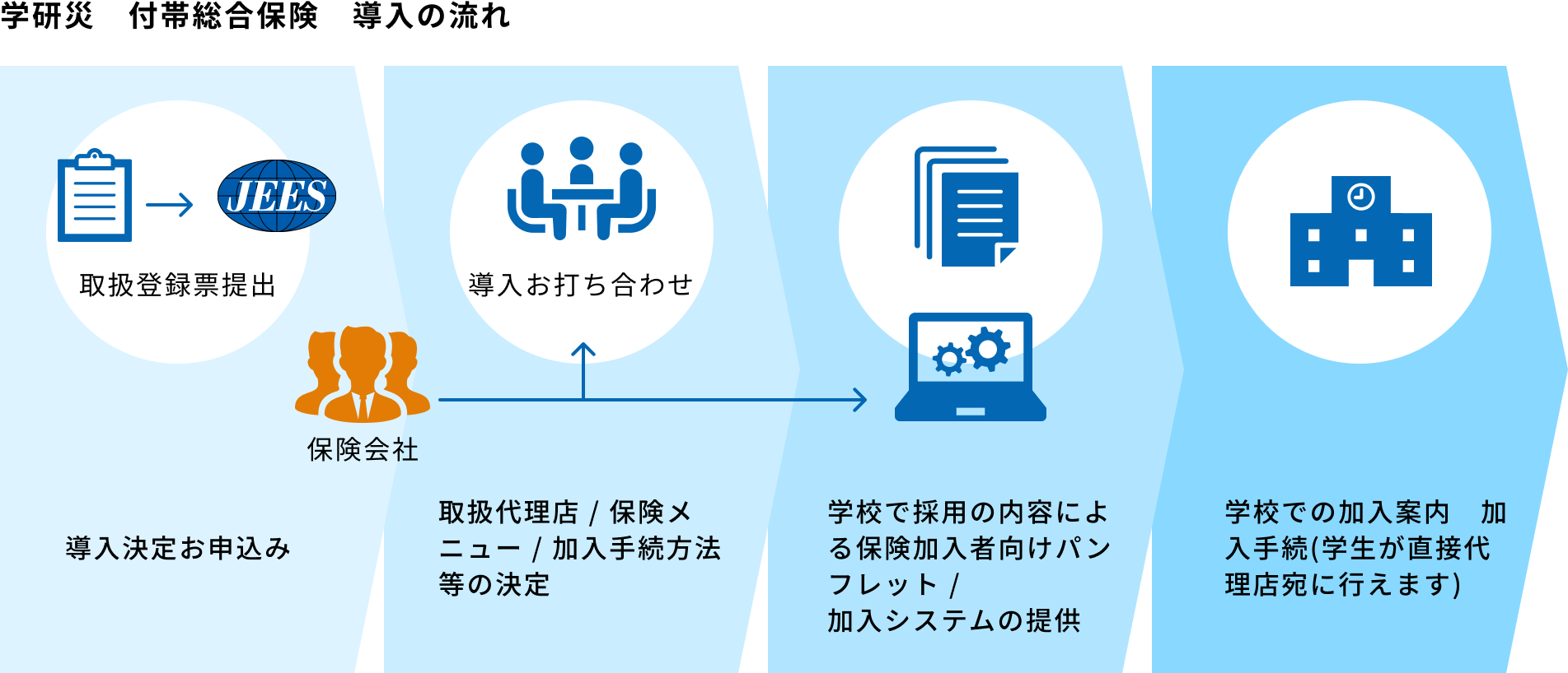 各付帯保険については、保険料の納付について学校を介さず、学生が直接本協会宛に行う形の加入手続と、学校で取りまとめて加入する手続きのいずれもが可能です。なお、各学校のご事情に則して保険会社よりご相談のうえ実際に提供する補償、パンフレット等や加入手続きの調整をさせていただくことから、導入から加入開始までに一定の期間が必要となる旨予めご了承ください。
